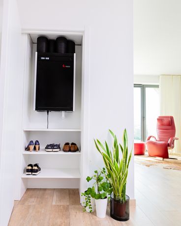 Découvrez notre unité de ventilation durable - si compacte qu'elle s'intègre facilement dans un élégant meuble ou un élégant espace de rangement.